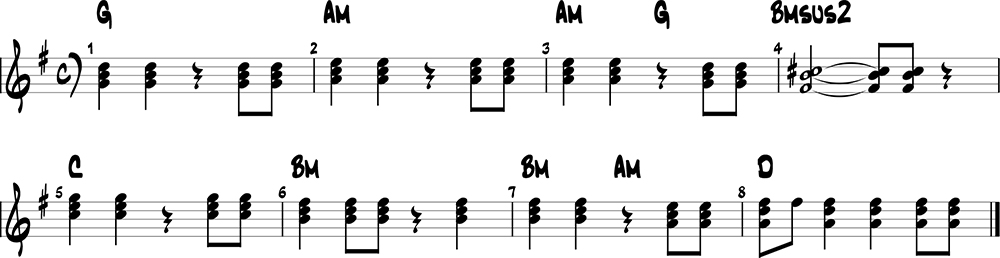 Vous n'êtes pas toujours obligé d'utiliser les 3 notes de chaque accord (fondamentale, tierce, quinte)